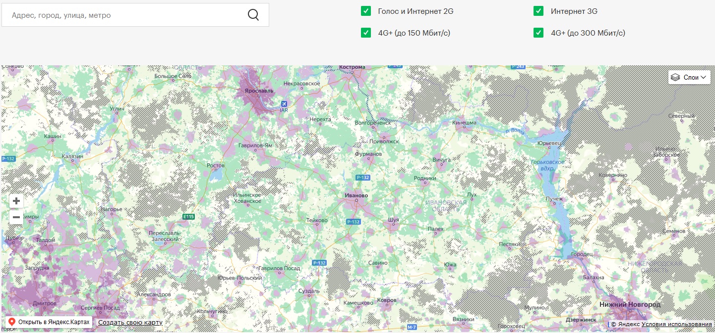 Информация о покрытии сети носит ориентировочный характер, фактическое покрытие сети и фактическая скорость приема/передачи данных зависит от типа и характеристик абонентского устройства, радиоусловий в месте нахождения абонента, особенностей рельефа и метеорологических условий, количества абонентов с устройствами, работающими в той же соте.